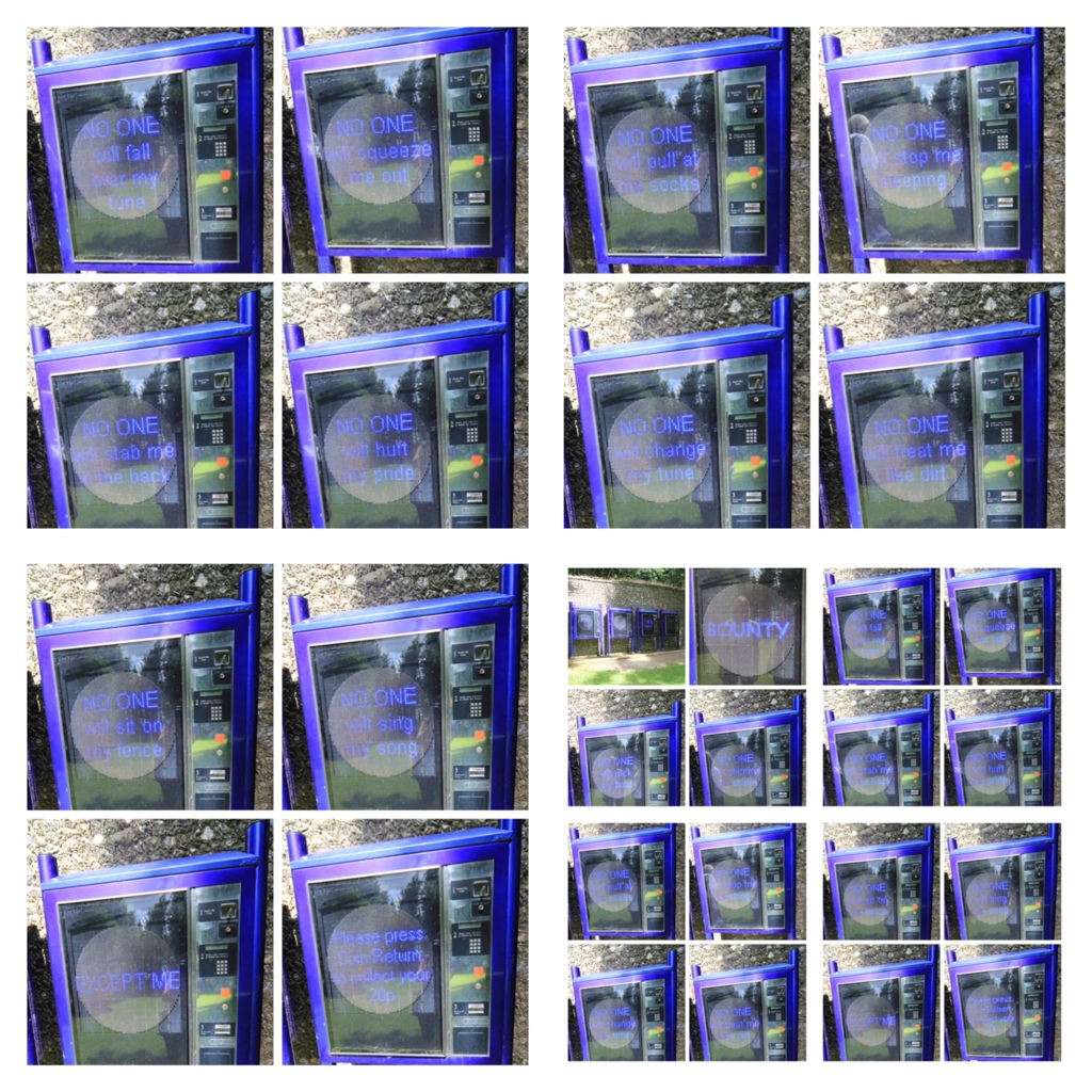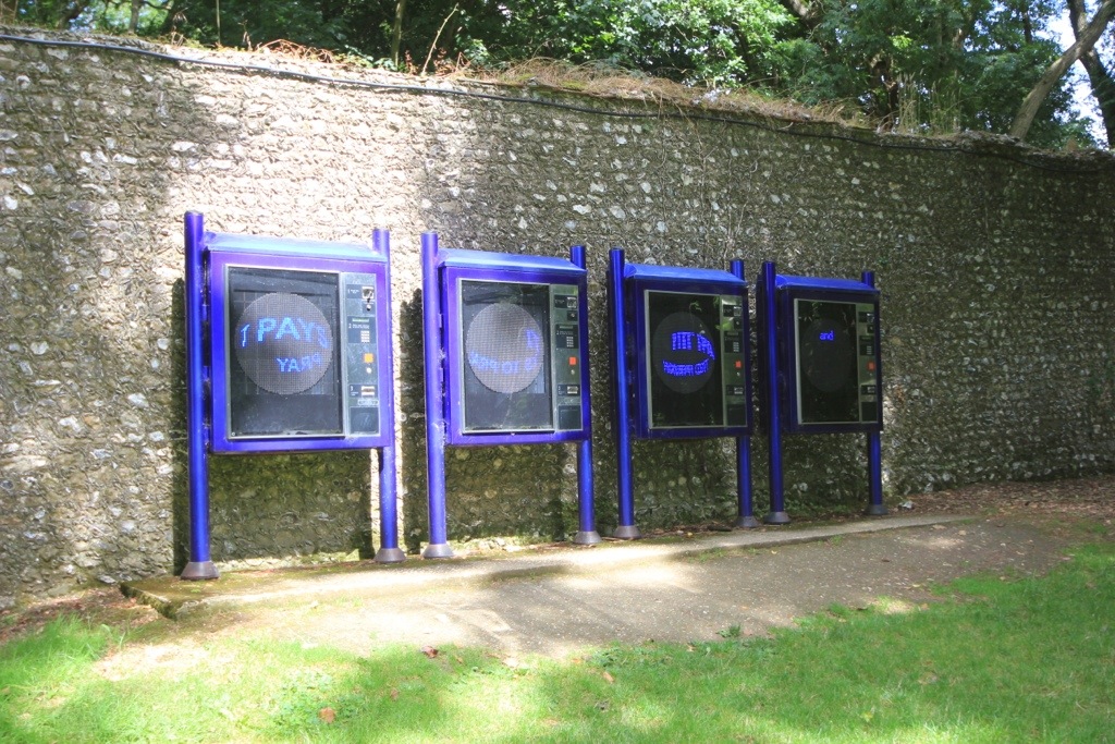 The first piece I am looking at I originally saw many years ago, and have recently been back to see. “It Pays to Pray” by ROSE FINN-KELCEY (1999) is exhibited at Cass Sculpture Park. This work is an interactive series of machines, similar in structure to a confectionary machine. You insert 20p and select a “prayer” like you would a chocolate. Each prayer is named after a chocolate bar (I chose bounty because the advert says it is “the taste of paradise”). At the end of the prefer you get your money back.
