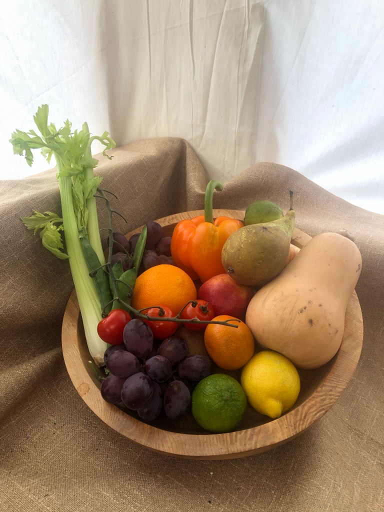 This week it is “bowl of fruit and veg” theme. Love it for the colours, exploring shapes and the challenges of perspective.